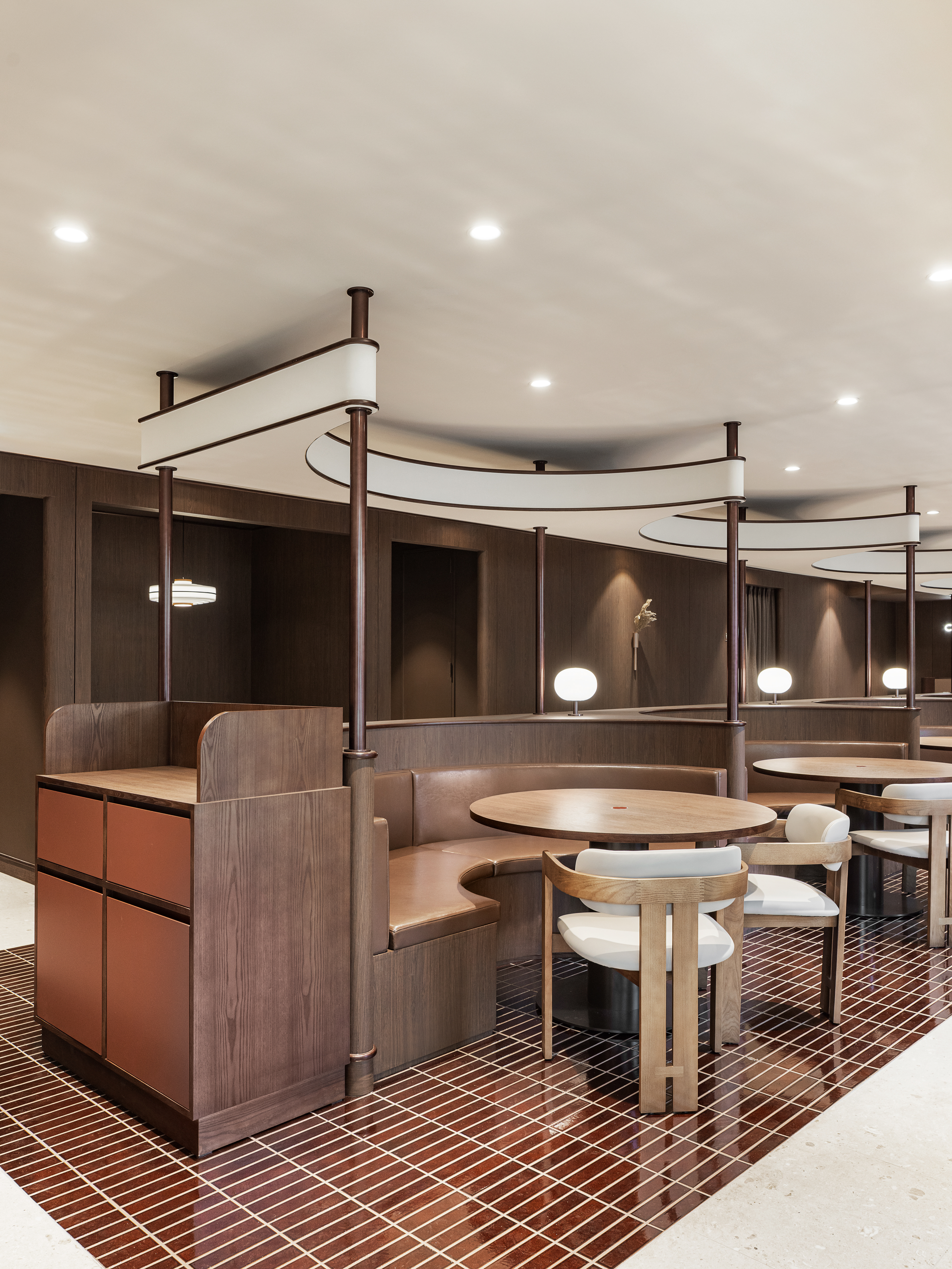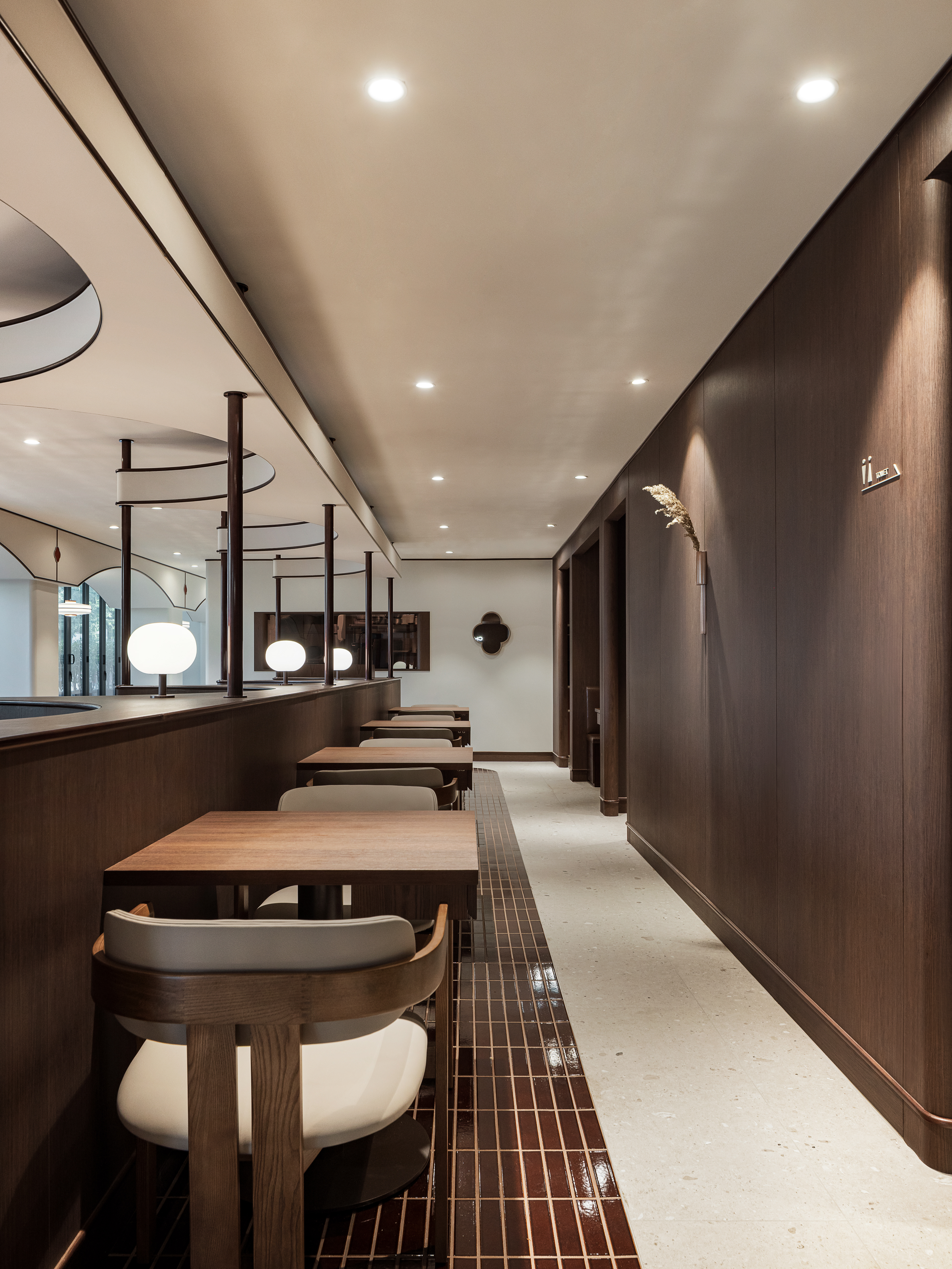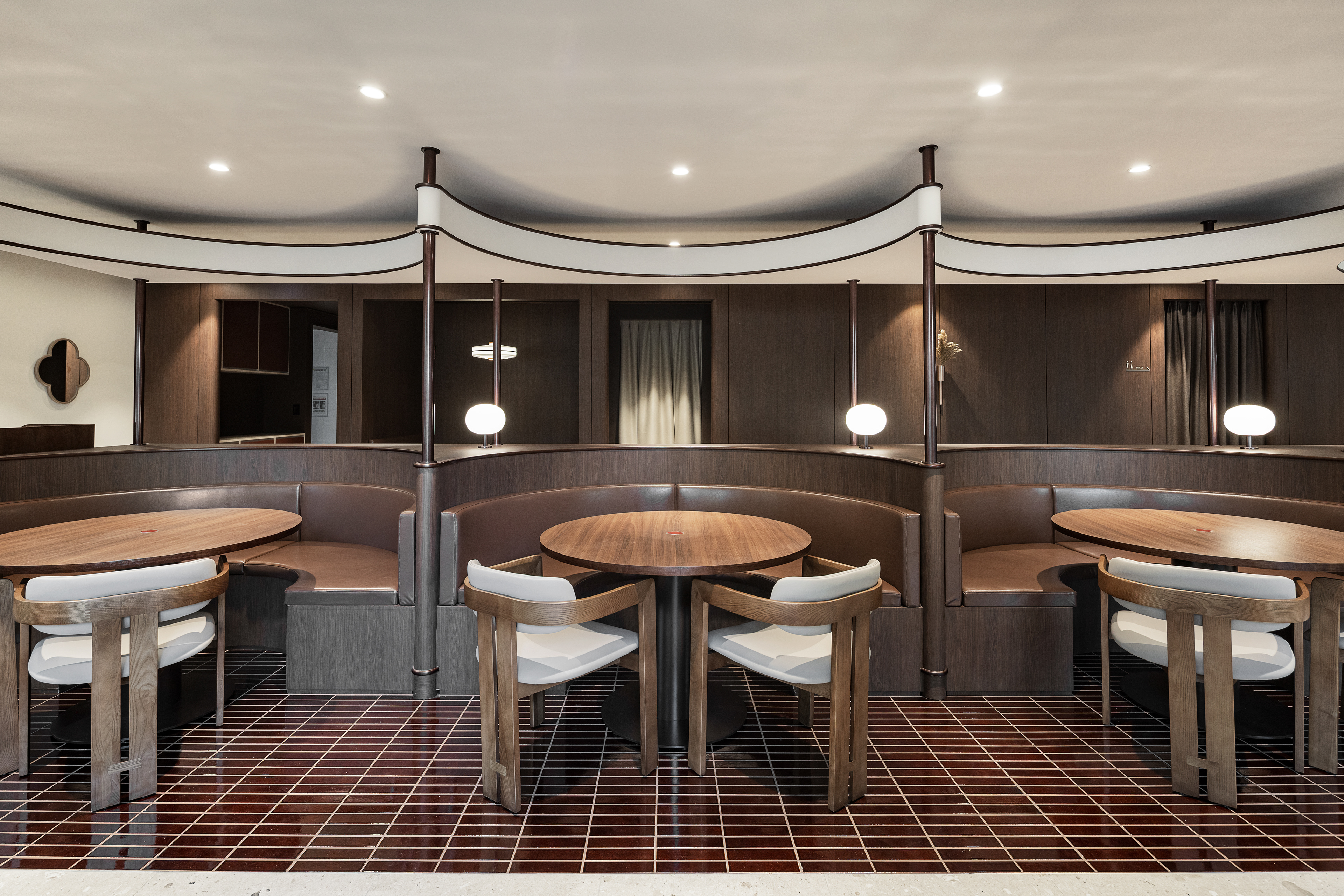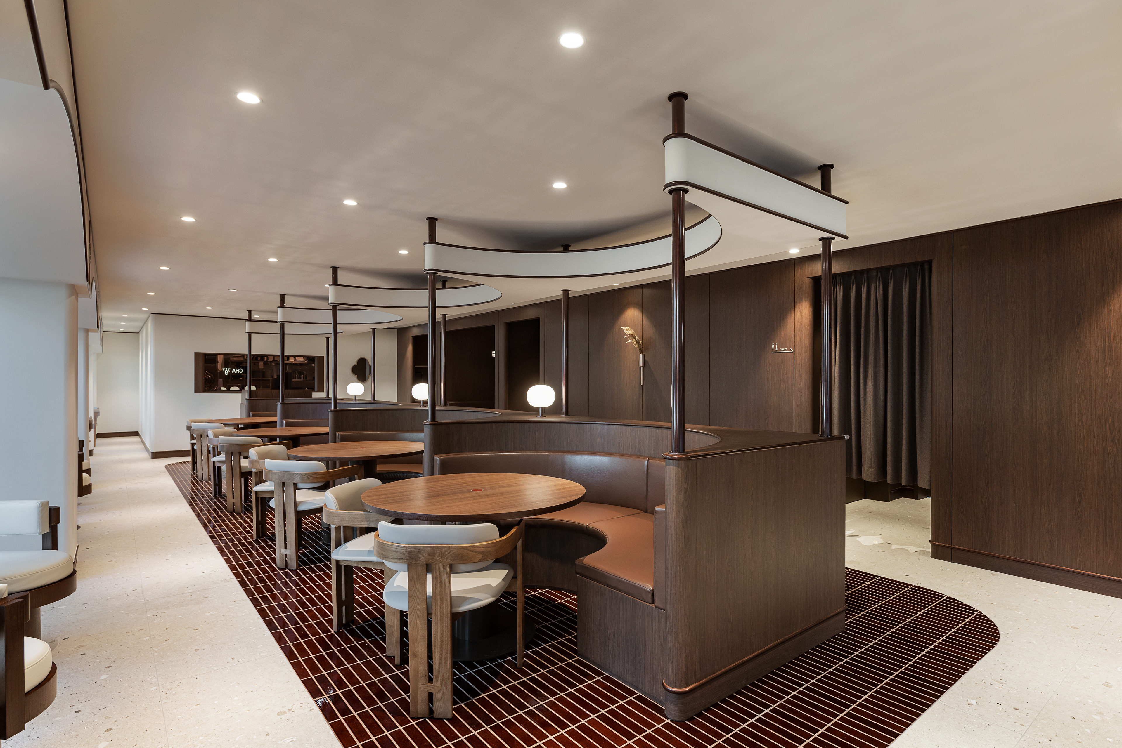 완만한 곡선 구조와 낮은 천정, 우드톤의 마감은 흐름에 안정감을 더하며