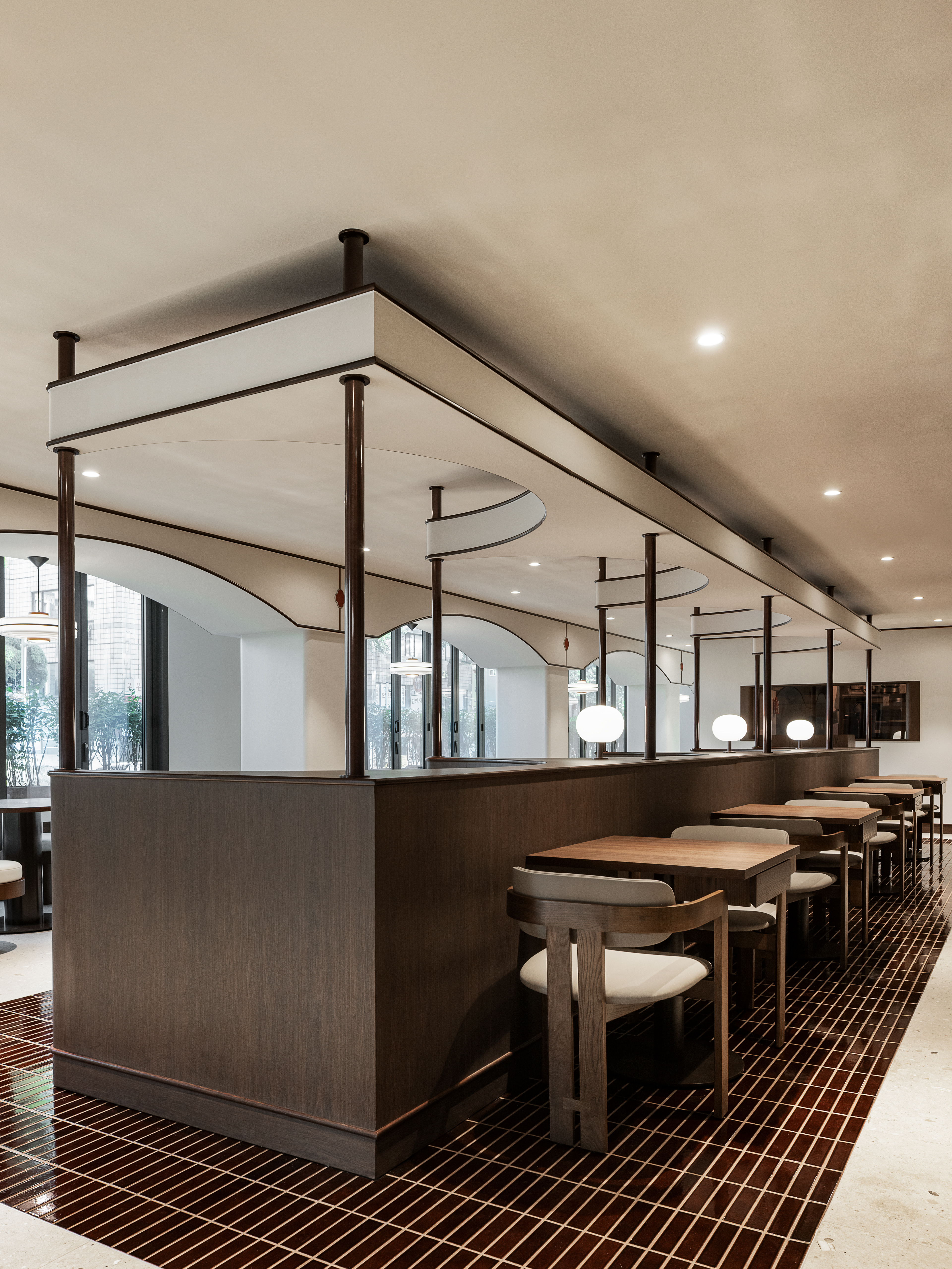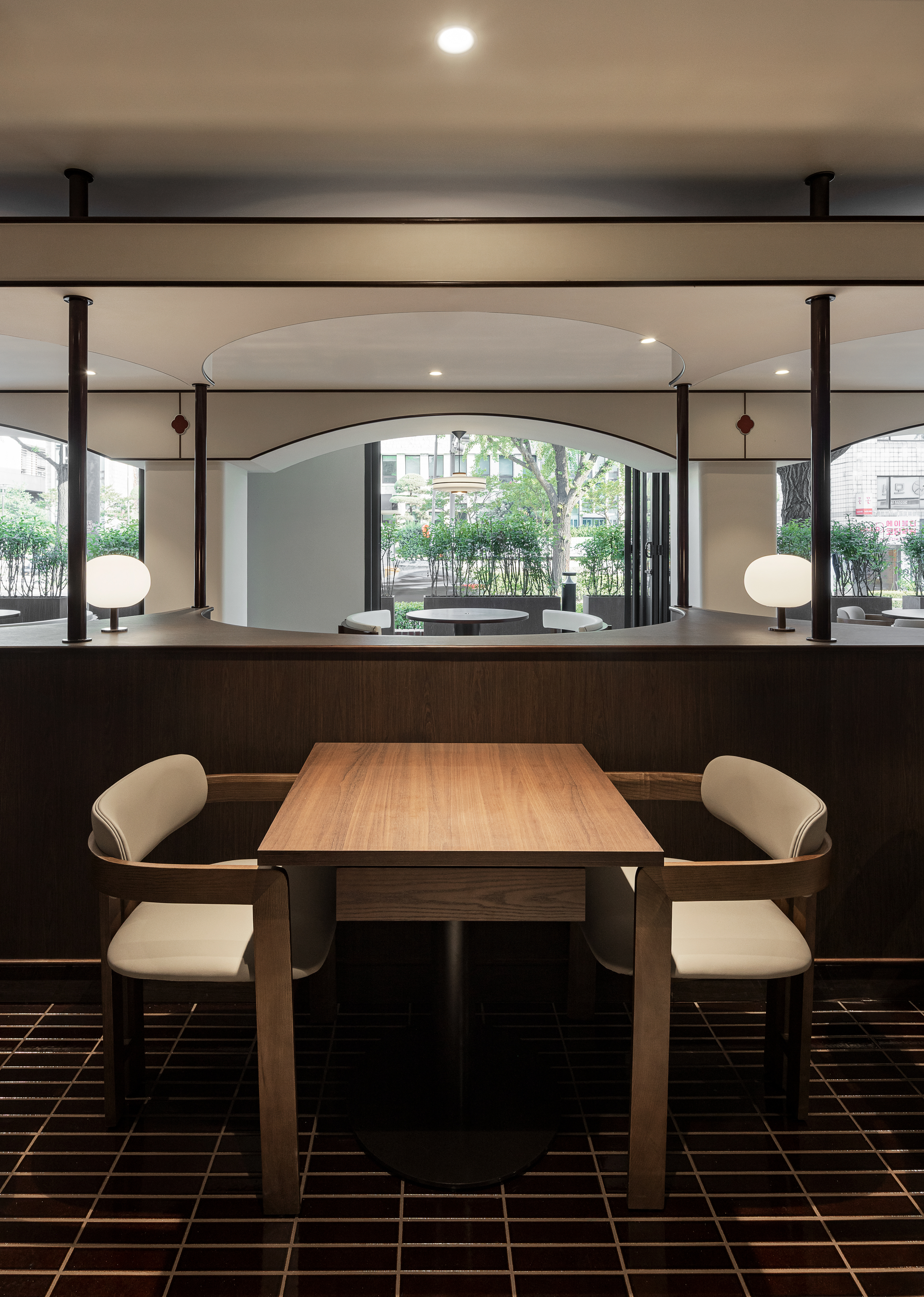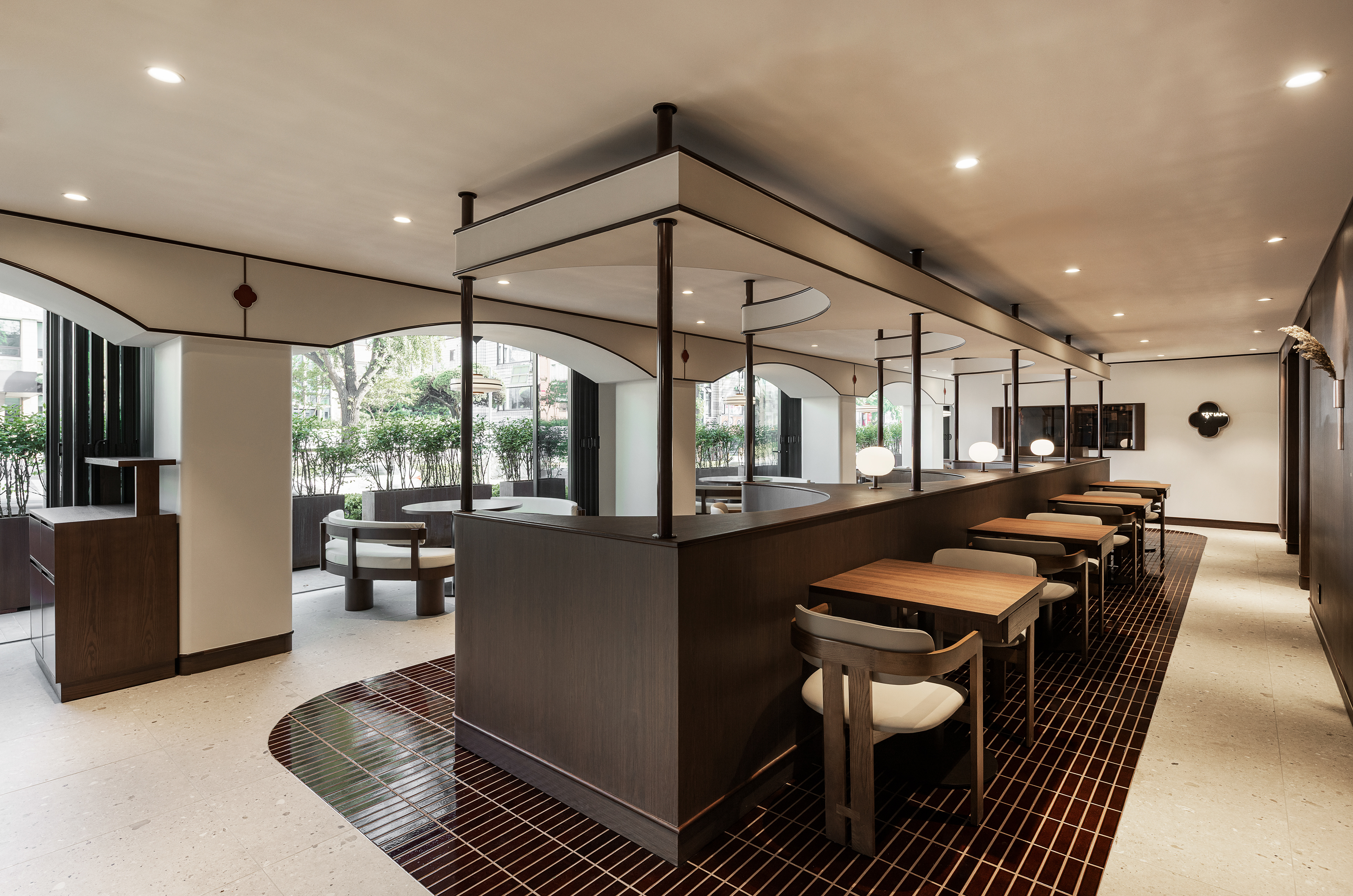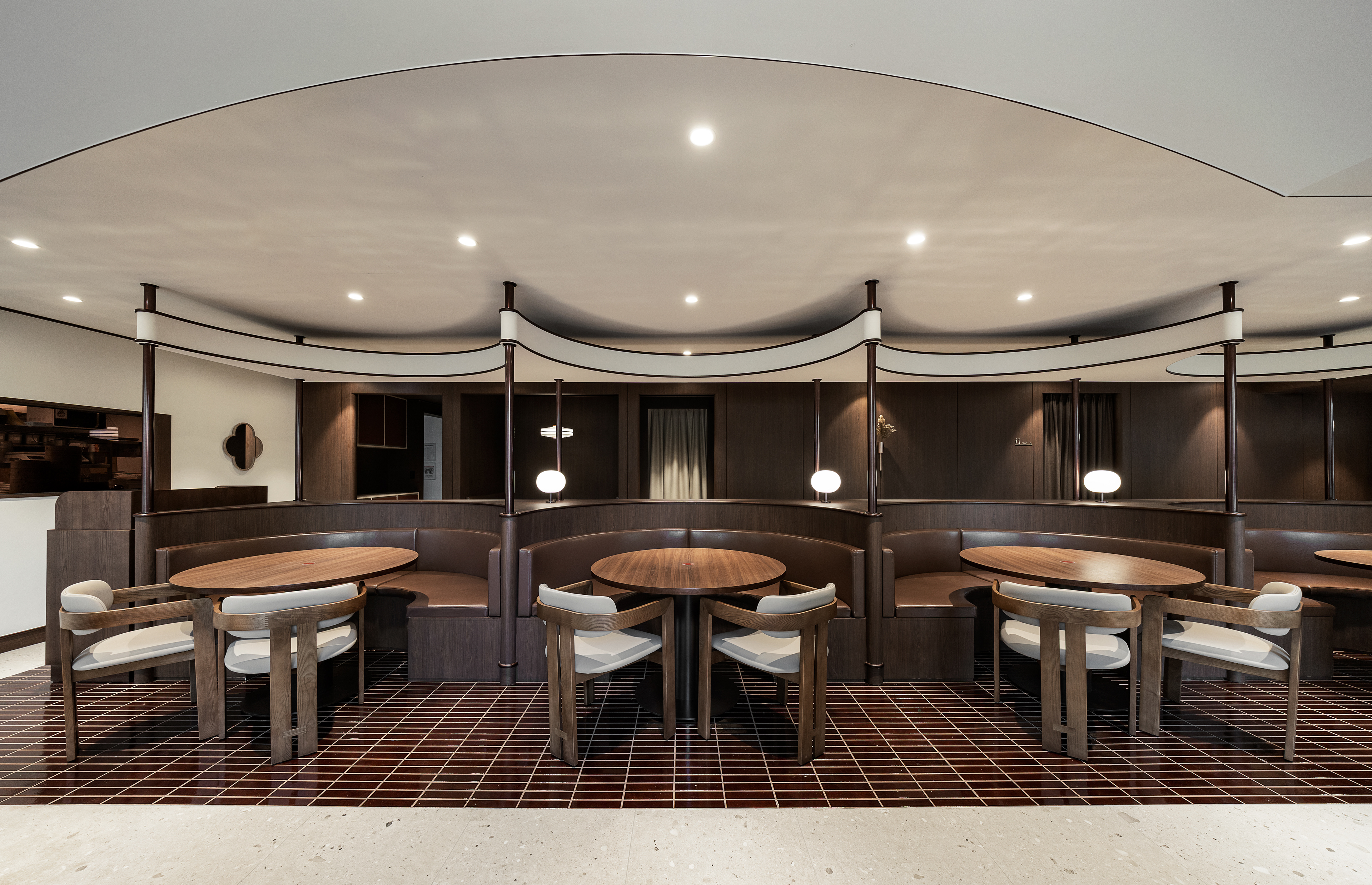 완만한 곡선 구조와 낮은 천정, 우드톤의 마감은 흐름에 안정감을 더하며