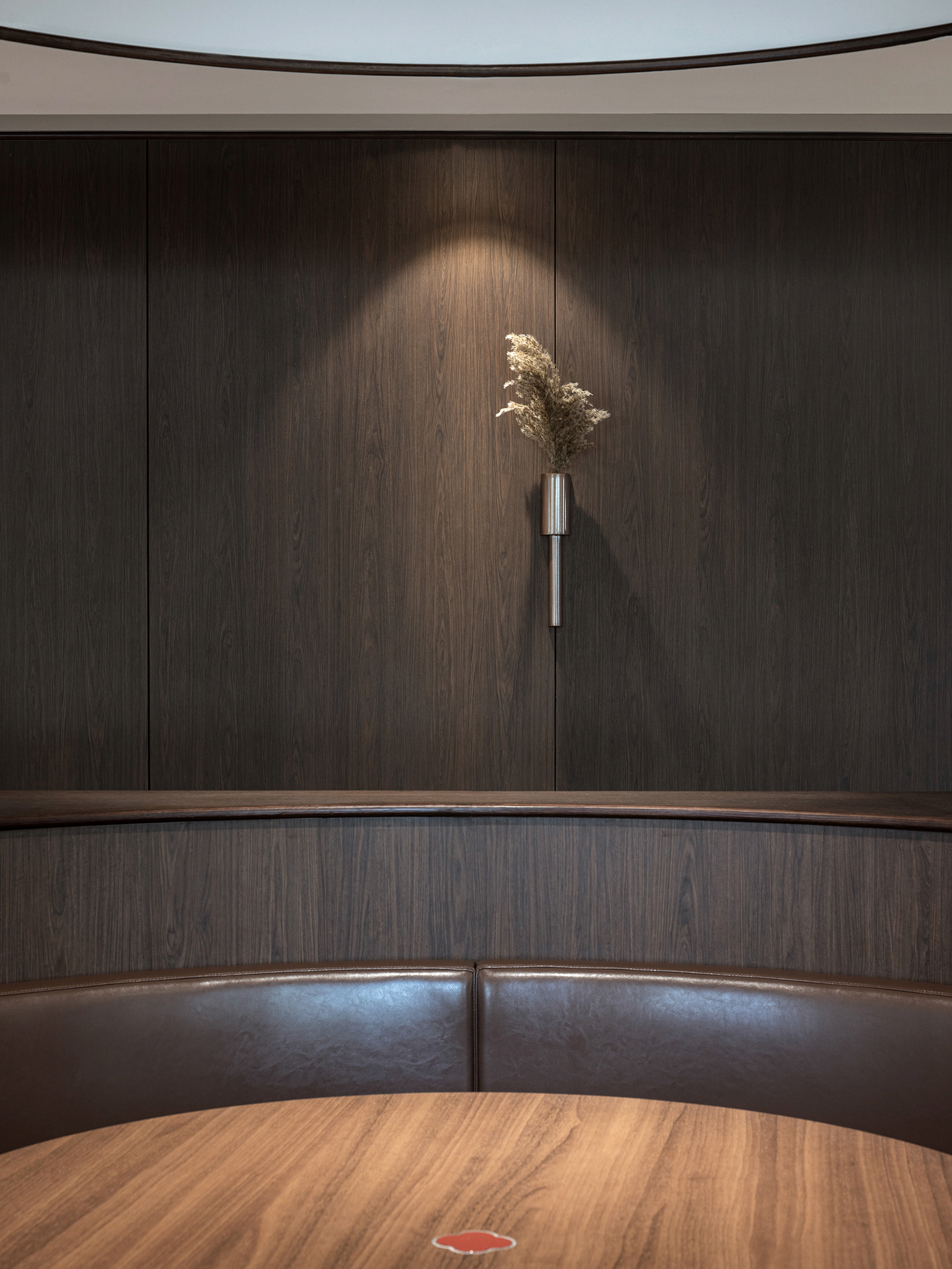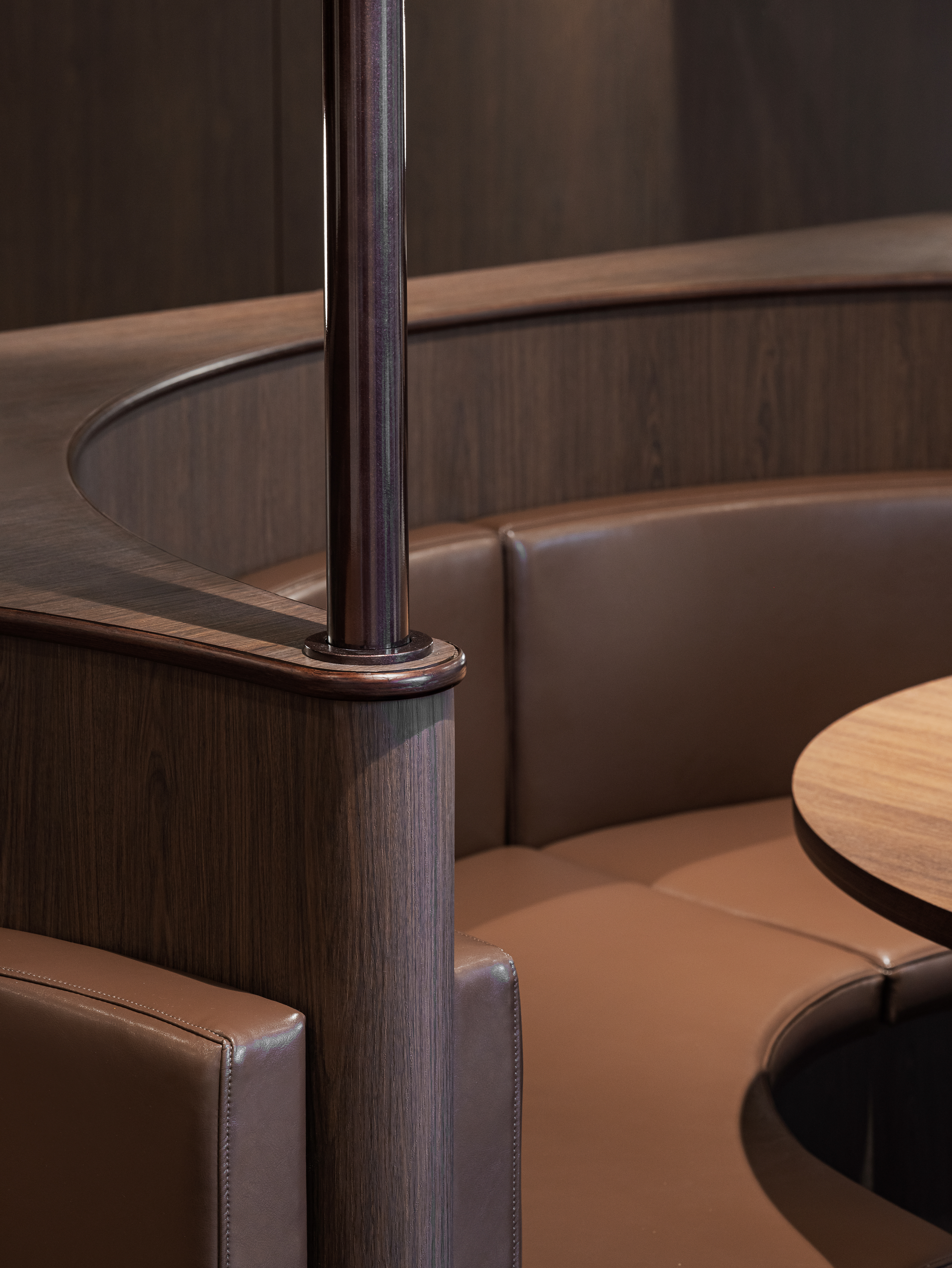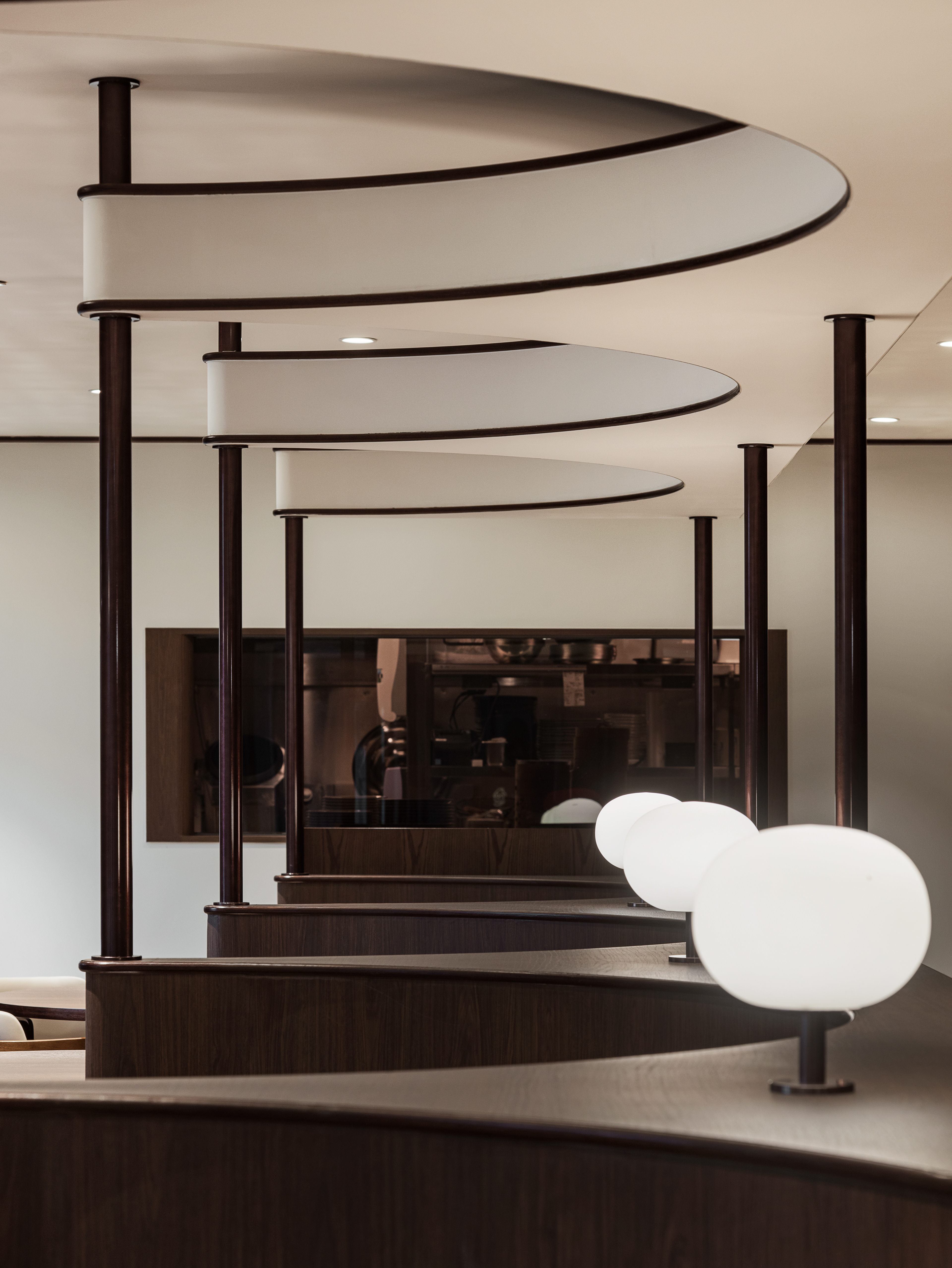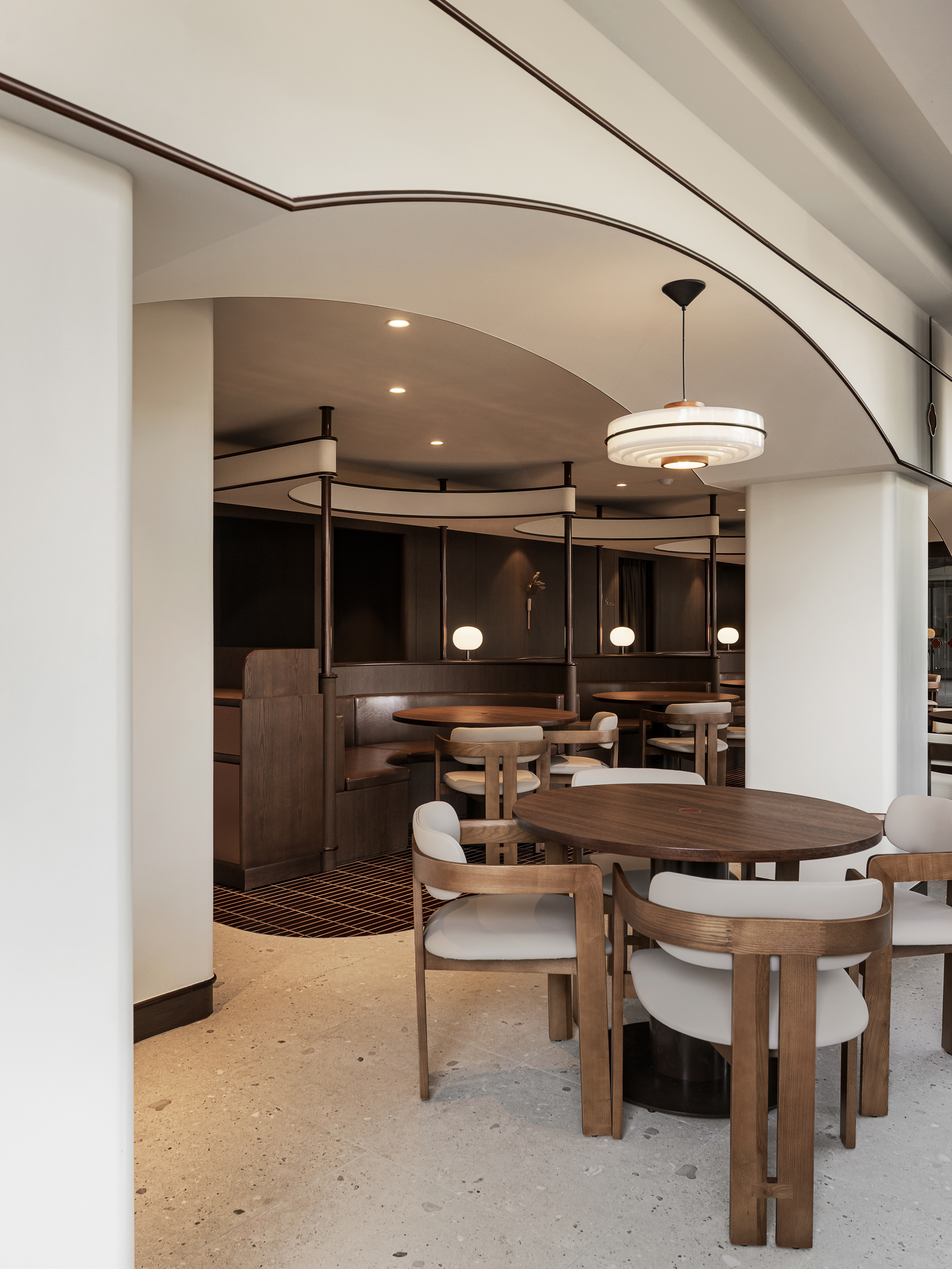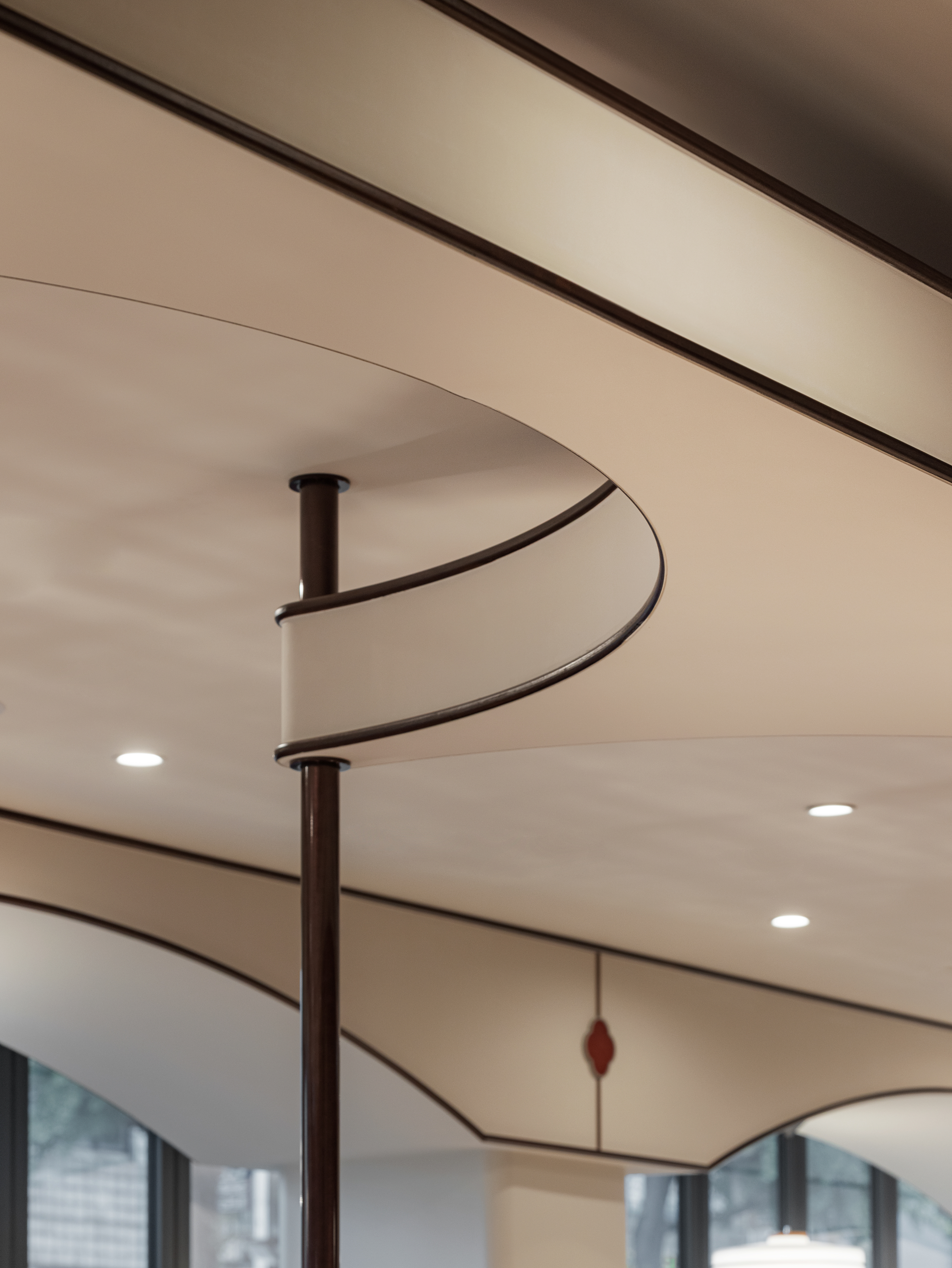 완만한 곡선 구조와 낮은 천정, 우드톤의 마감은 흐름에 안정감을 더하며