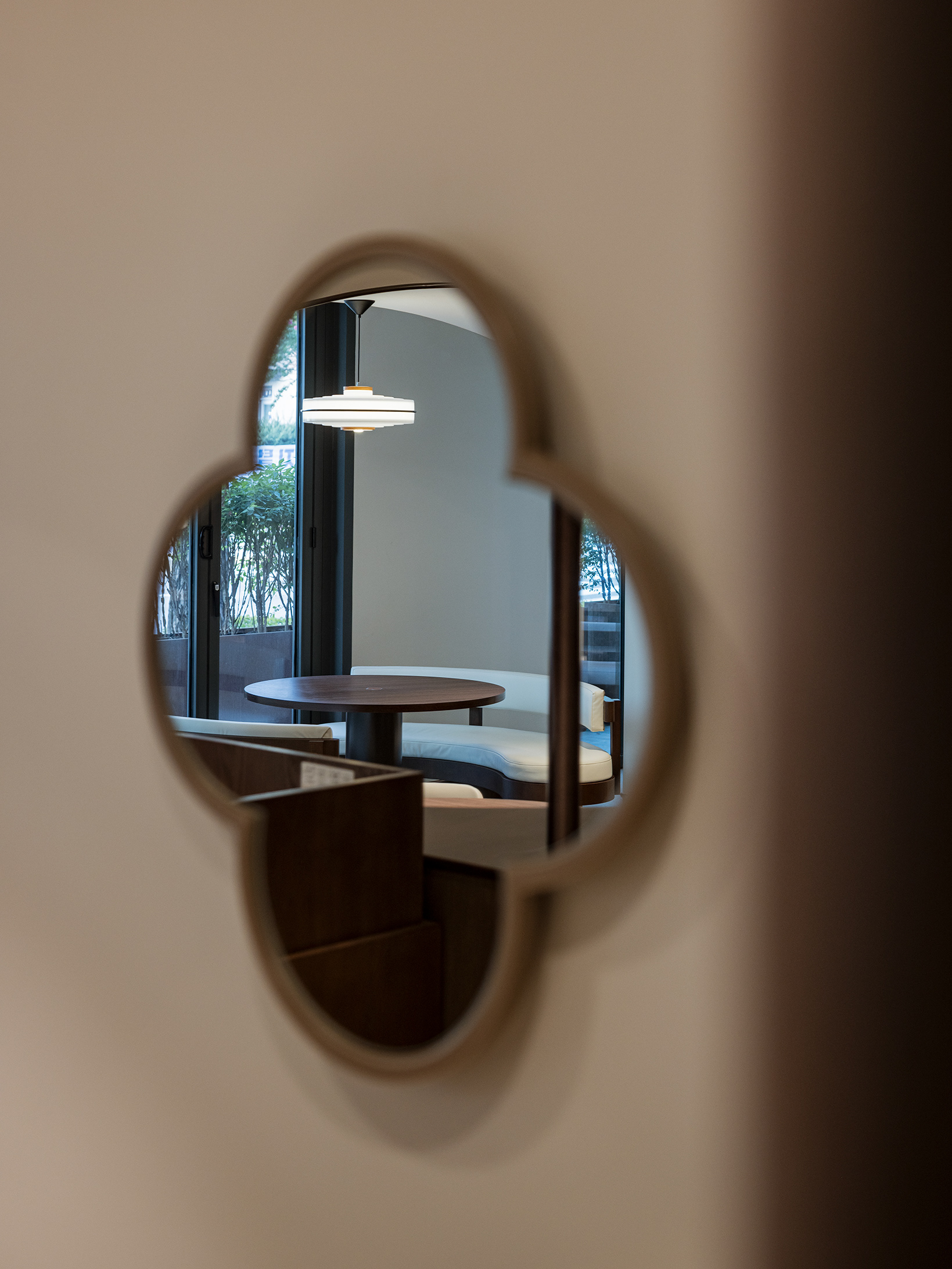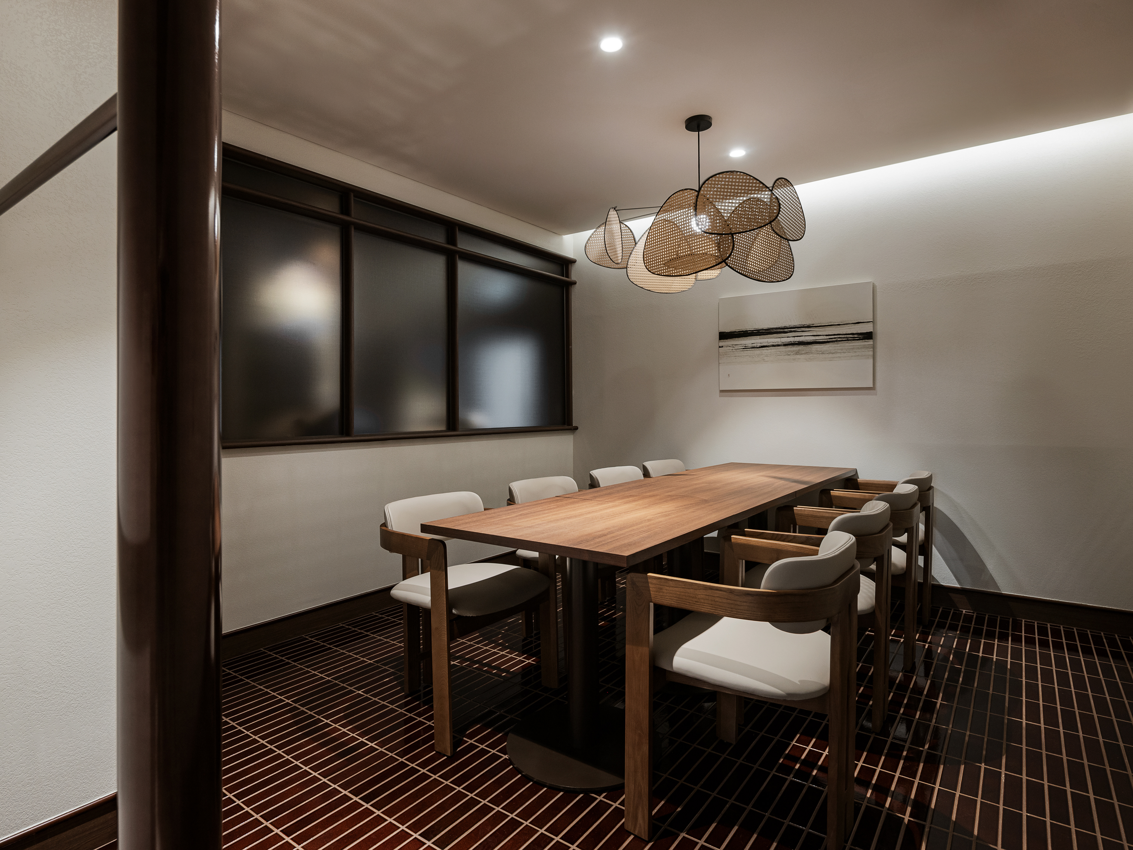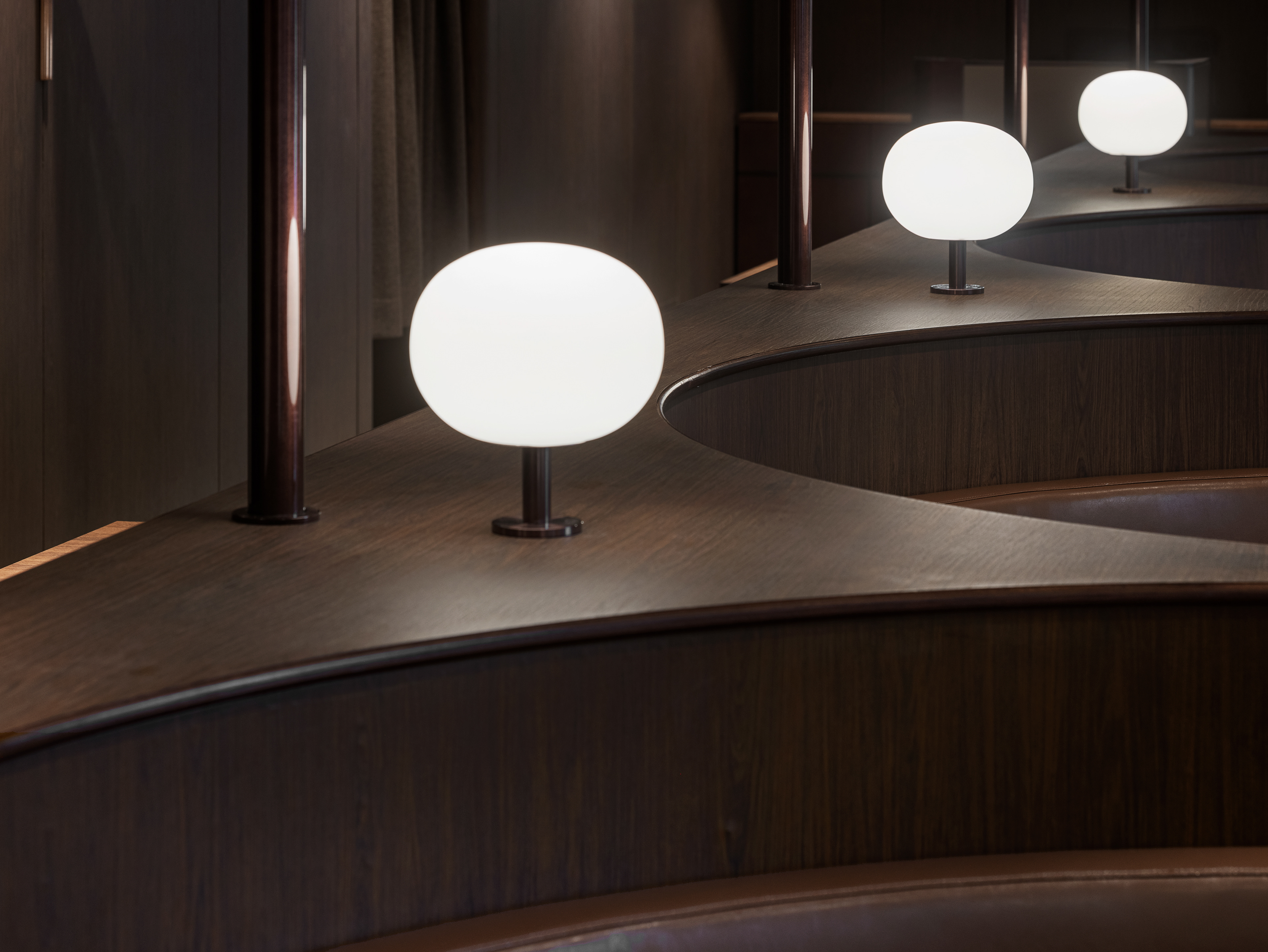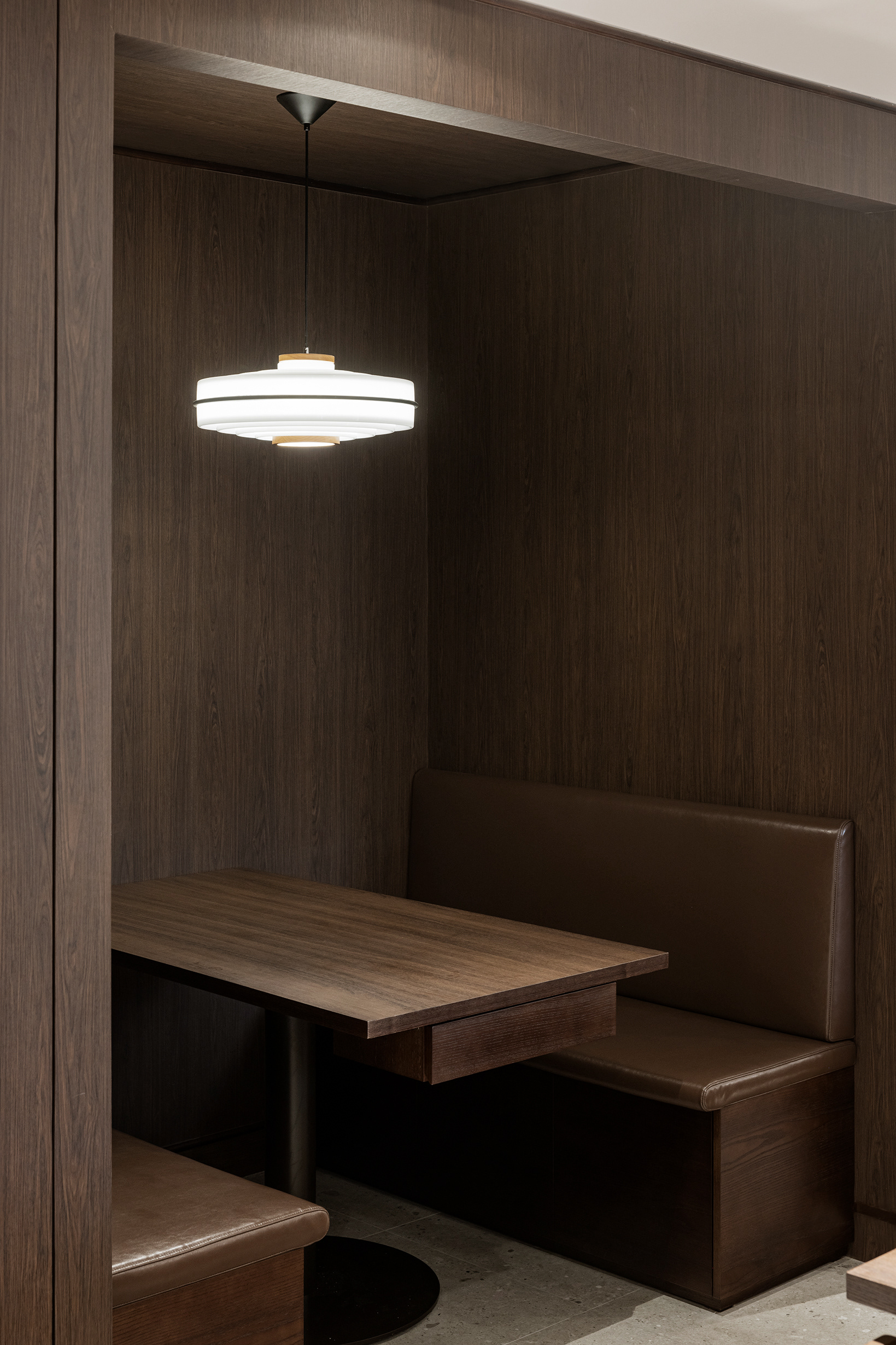 완만한 곡선 구조와 낮은 천정, 우드톤의 마감은 흐름에 안정감을 더하며